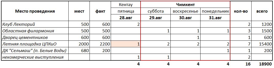 Итоговая таблица – места, даты, количество выступлений и зрителей по первой части казахстанских гастролей.
