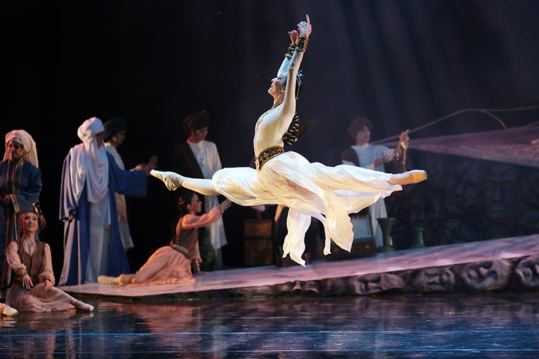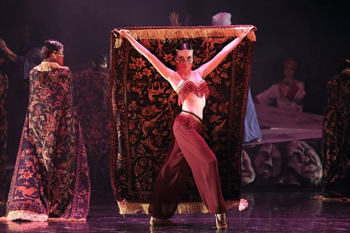 В постановке задействована практически вся труппа театра. Главные герои танцуют, раскрывая всю гамму эмоций и переживаний своих персонажей, а танцоры второго плана создают живую атмосферу Востока, отражая его многообразие и динамичность. Каждый жест, каждое движение пронизаны смыслом, а хореография позволяет не только рассказывать историю, но и передавать ее глубинные философские идеи.