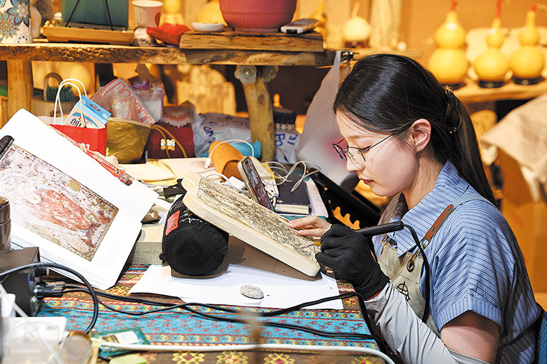 9 сентября. Ученица занимается выжиганием в студии в культурно-туристическом городке Туюйгоу в уезде Шаньшань. ВАН ЦЗЫЖУ / CHINA NEWS SERVICE