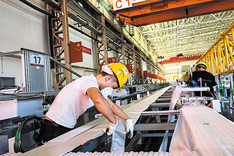 12 сентября. Рабочие собирают лопасти турбины на ветряной электростанции компании Sany Heavy Industry в Тачэне, Синьцзян-Уйгурский автономный район. ЧЖАО ИМЭН / CHINA DAILY
