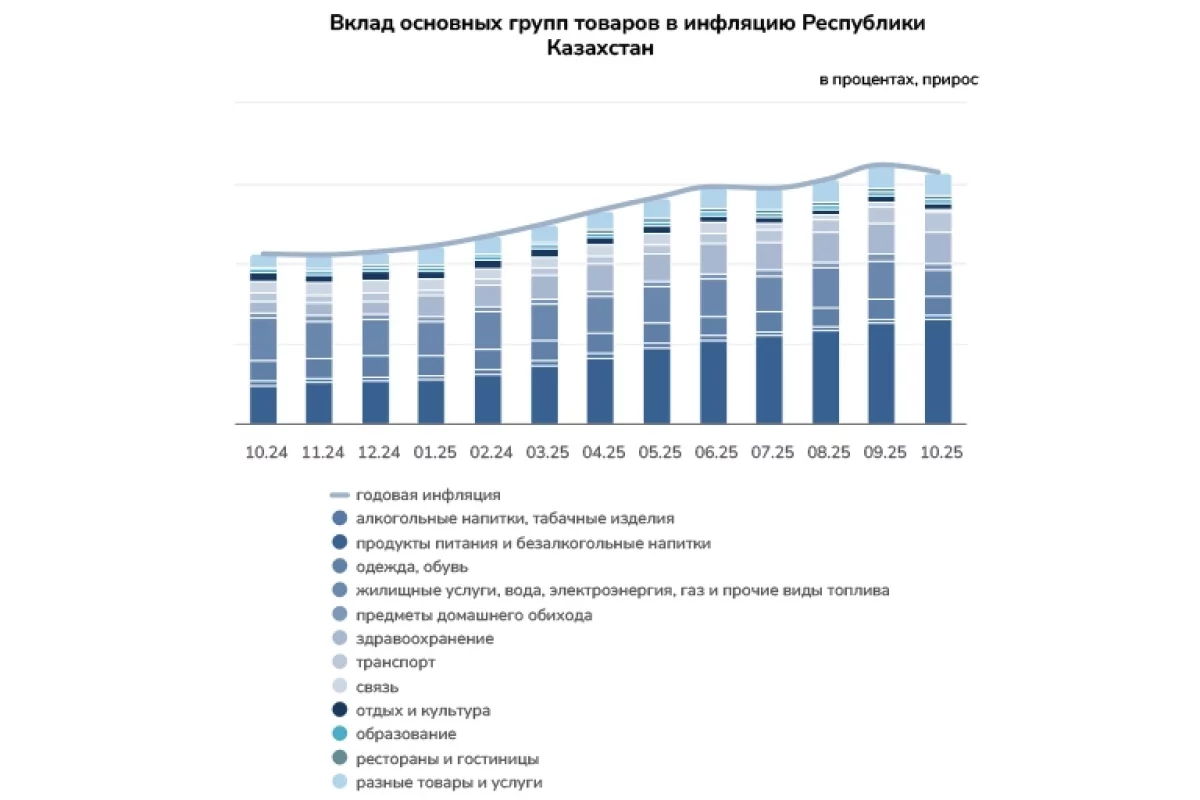 К слову, по предварительным данным Бюро национальной статистики, в октябре цены на платные услуги в годовом исчислении выросли на 12,9% (в сентябре – 15,3%), продовольственные товары – на 13,5% (в сентябре – 12,7%), непродовольственные товары – на 11% (в сентябре – 10,8%). Наибольший вклад в годовой уровень инфляции внесли продукты питания и безалкогольные напитки (5,2%), здравоохранение (1,6%), жилищные услуги (1,3%).